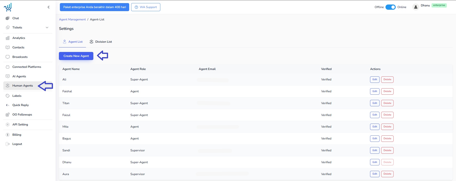 Masuk ke Side Bar “Human Agent” lalu “Tambahkan Human Agent Baru“. Ketentuan akses Human Agent klik disini