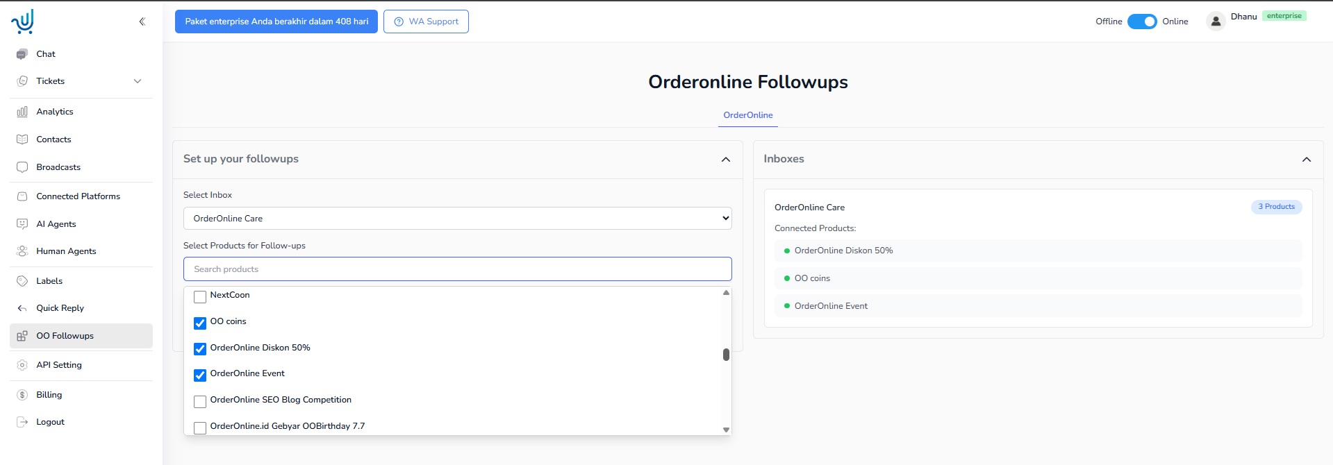 - OO Followups untuk memilih Channel Whatsapp dan Product mana saja yang harus di follow up di Channel Whatsapp dipilih