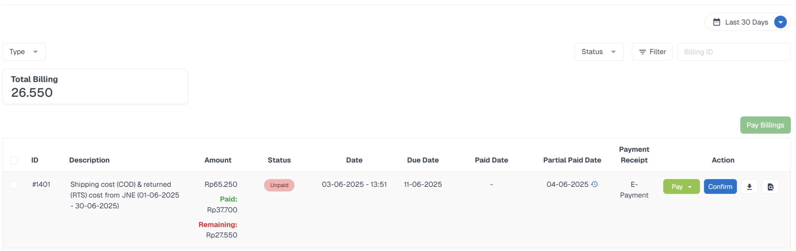 Kami dengan senang hati menginformasikan bahwa kini seller dapat lebih mudah mengelola pembayaran tagihan menggunakan Credit. Dengan fitur baru ini, Anda dapat melakukan pembayaran penuh atau sebagian untuk beberapa jenis tagihan, termasuk Shipping Cost, Return Shipping Cost, Plan Subscription, dan Shipping Cost Adjustment. Jika saldo Anda lebih kecil dari total tagihan, Anda masih dapat melakukan pembayaran sebagian. Lihat demo di bawah untuk panduan lebih lanjut tentang cara menggunakan fitur pembayaran ini.