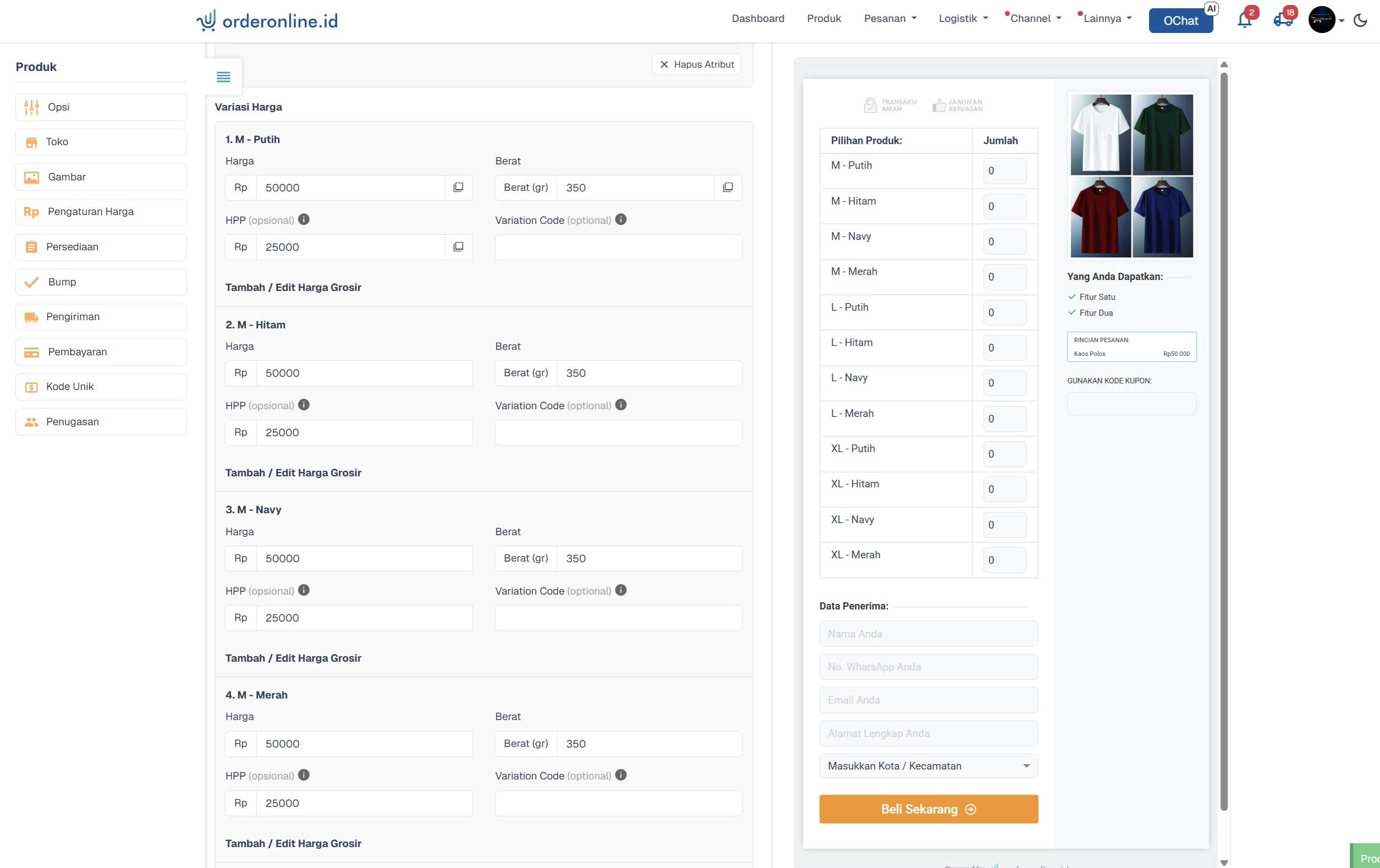 - COD: Untuk menggunakan fitur COD pada produk anda, anda dapat mengaturnya dengan cara melihat tutorial di link ini: https://help.orderonline.id/opsi-pembayaran-cod/
